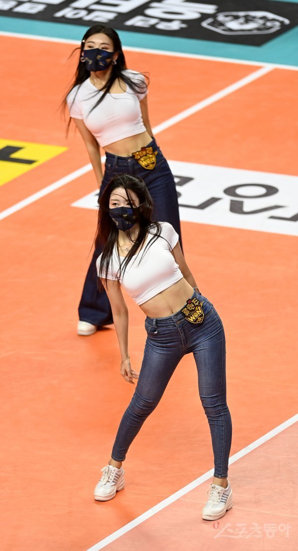 24일 서울 장충체육관에서 열린 ‘2022~2023 도드람 V-리그’ 남자부 우리카드와 현대캐피탈 경기에서 치어리더가 공연을 펼치고 있다.