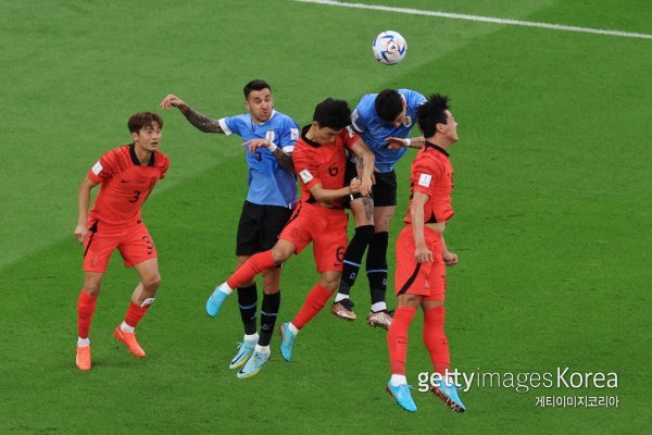 24일 카타르 알라얀 에듀케이션 시티 스타디움에서 열리는 2022 FIFA 카타르 월드컵 조별리그 H조 1차전 대한민국과 우루과이 경기에서 한국 김영권과 황인범이 우루과이의 공격을 막아내고 있다.