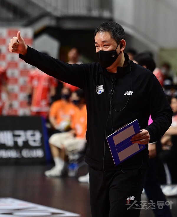 27일 안산 상록수체육관에서 열린 ‘2022-2023 도드람 V-리그’ 남자부 안산 OK금융그룹과 천안 현대캐피탈의 경기에서 현대캐피탈 최태웅 감독이 선수들에게 엄지를 치켜세우고 있다.