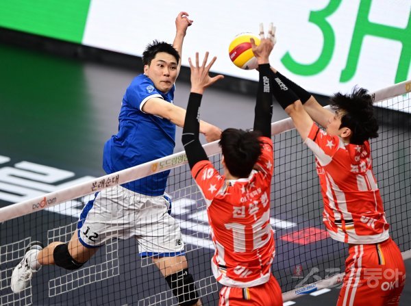 27일 안산 상록수체육관에서 열린 ‘2022-2023 도드람 V-리그’ 남자부 안산 OK금융그룹과 천안 현대캐피탈의 경기에서 현대캐피탈 전광인이 OK금융그룹 블로커 앞에서 스파이크를 하고 있다.