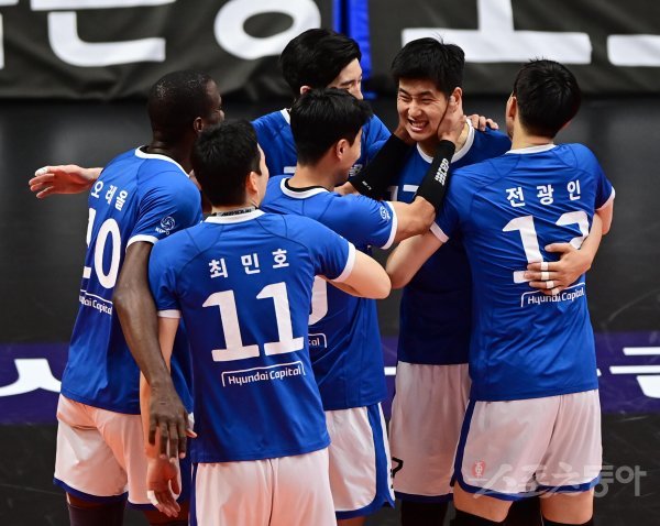 27일 안산 상록수체육관에서 열린 ‘2022-2023 도드람 V-리그’ 남자부 안산 OK금융그룹과 천안 현대캐피탈의 경기에서 현대캐피탈 박상하가 리시브 실수를 유도한 서브로 득점에 성공한 후 동료들의 축하를 받고 있다.