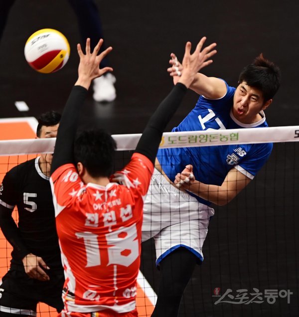 27일 안산 상록수체육관에서 열린 ‘2022-2023 도드람 V-리그’ 남자부 안산 OK금융그룹과 천안 현대캐피탈의 경기에서 현대캐피탈 박상하고 OK금융그룹 블로커 앞에서 스파이크를 하고 있다.