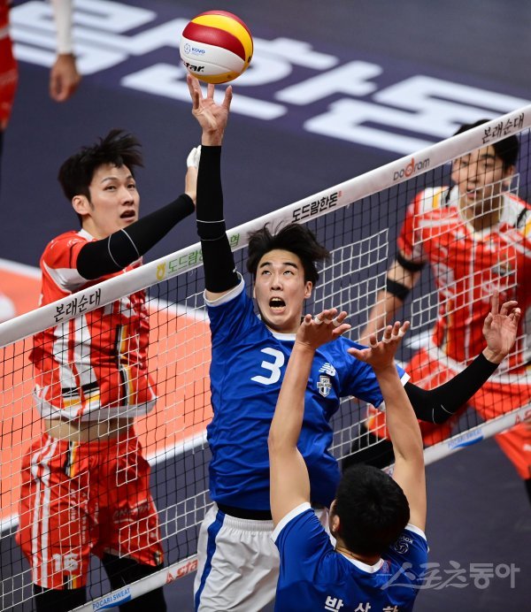 27일 안산 상록수체육관에서 열린 ‘2022-2023 도드람 V-리그’ 남자부 안산 OK금융그룹과 천안 현대캐피탈의 경기에서 현대캐피탈 김명관이 실책성 리시브를 토스하고 있다.
