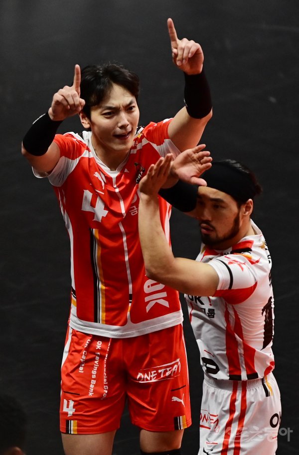 27일 안산 상록수체육관에서 열린 ‘2022-2023 도드람 V-리그’ 남자부 안산 OK금융그룹과 천안 현대캐피탈의 경기에서 OK금융그룹 조재성이 득점에 성공한 후 부용찬과 기쁨을 나누고 있다.