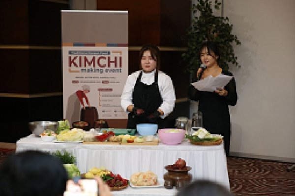 한식진흥원 파견강사 정그림 셰프의 한국의 김치 및 김장문화 프레젠테이션을 시작으로 직접 김치를 담가보는 시간을 가진 각국 대사 부인들은 들뜬 표정으로 김치 속을 배추에 버무리며 김장 체험에 적극적으로 참여했다.