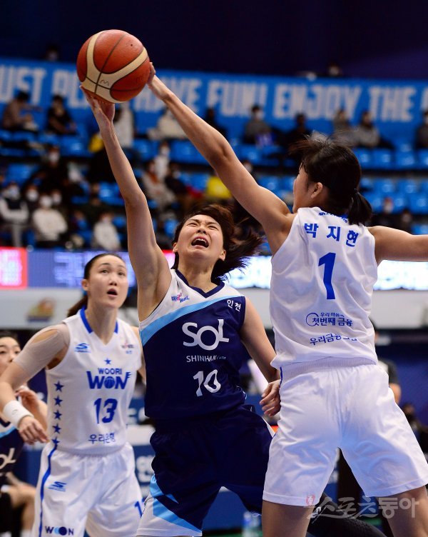 27일 인천 도원체육관에서 열린 ‘신한은행 SOL 2022-2022 여자프로농구’ 인천 신한은행과 아산 우리은행의 경기에서 신한은행 유승희의 슛이 우리은행 박지현의 수비에 막히고 있다.