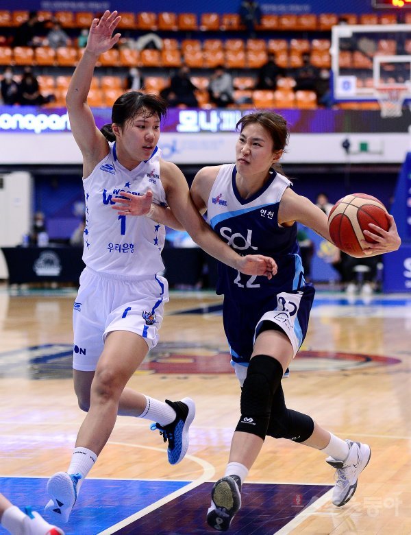 27일 인천 도원체육관에서 열린 ‘신한은행 SOL 2022-2022 여자프로농구’ 인천 신한은행과 아산 우리은행의 경기에서 신한은행 구슬이 우리은행 박지현의 수비를 제치며 돌파를 시도하고 있다.