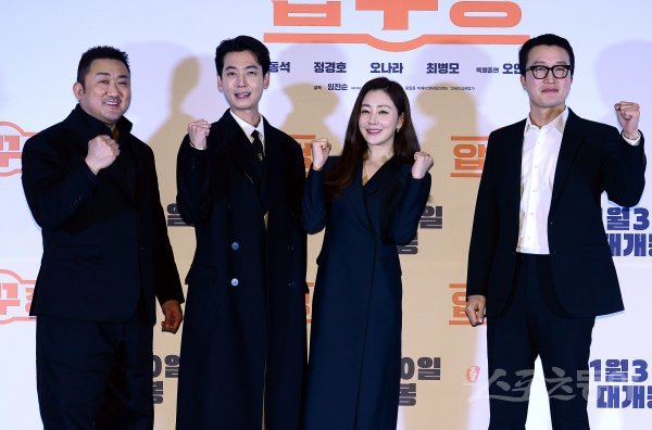 배우 마동석, 정경호, 오나라, 최병모가 28일 오후 서울 롯데시네마 건대입구점에서 열린 영화 ‘압꾸정’ 언론시사회에 참석해 카메라를 향해 포즈를 취하고 있다.