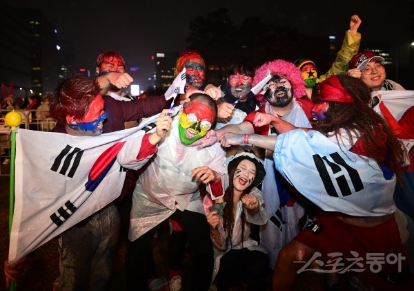 28일 서울 광화문광장에서 열린 ‘2022 카타르 월드컵’ 한국과 가나의 경기 승리를 기원하는 시민들이 거리 응원을 펼치고 있다.