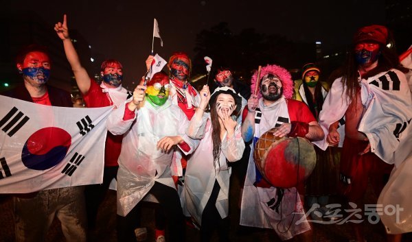28일 서울 광화문광장에서 열린 ‘2022 카타르 월드컵’ 한국과 가나의 경기 승리를 기원하는 시민들이 거리 응원을 펼치고 있다.