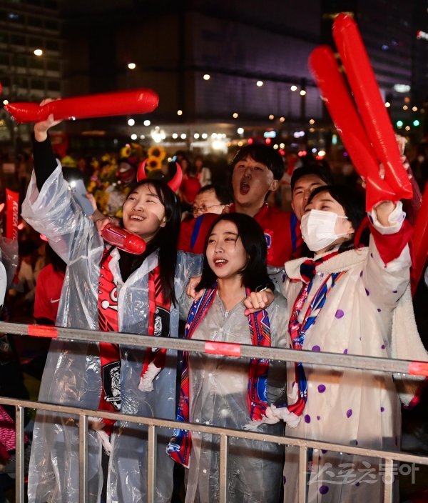 28일 서울 광화문광장에서 열린 ‘2022 카타르 월드컵’ 한국과 가나의 경기 승리를 기원하는 시민들이 거리 응원을 펼치고 있다.