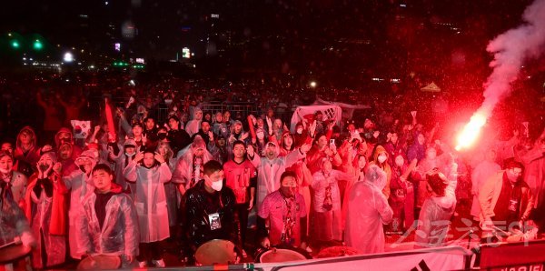 28일 서울 광화문광장에서 열린 ‘2022 카타르 월드컵’ 한국과 가나의 경기 승리를 기원하는 시민들이 거리 응원을 펼치고 있다.