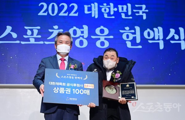 전 마라토너 이봉주가 29일 서울 송파구 방이동 서울올림픽파크텔에서 열린 ‘2022 대한민국 스포츠영웅 헌액식’에서 헌액패를 받아 이기흥 대한체육회 회장과 기념 촬영을 하고 있다.