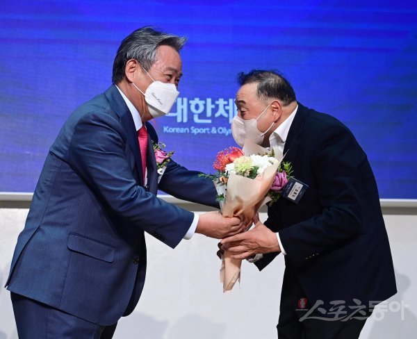전 마라토너 이봉주가 29일 서울 송파구 방이동 서울올림픽파크텔에서 열린 ‘2022 대한민국 스포츠영웅 헌액식’에서 이기흥 대한체육회 회장으로부터 헌액패와 꽃다발을 받고 있다.