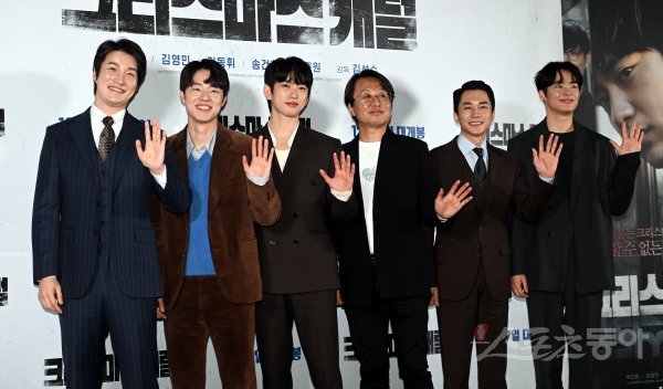 29일 서울 강남구 메가박스 코엑스점에서 열린 영화 ‘크리스마스 캐럴’ 시사회에서 배우 허동원, 송건희, 박진영, 김성수 감독, 김영민, 김동휘가 포토타임을 갖고 있다.