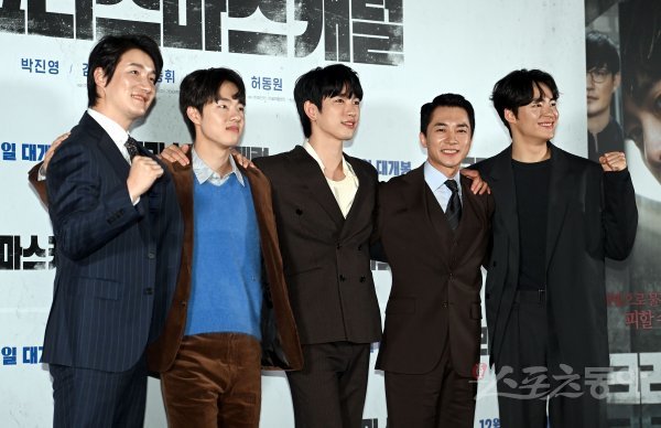 29일 서울 강남구 메가박스 코엑스점에서 열린 영화 ‘크리스마스 캐럴’ 시사회에서 배우 허동원, 송건희, 박진영, 김영민, 김동휘가 포토타임을 갖고 있다.