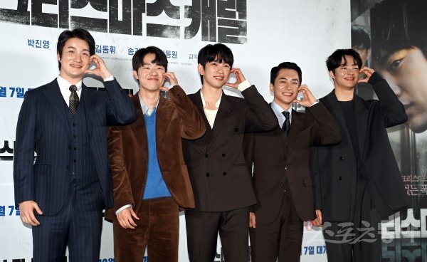 29일 서울 강남구 메가박스 코엑스점에서 열린 영화 ‘크리스마스 캐럴’ 시사회에서 배우 허동원, 송건희, 박진영, 김영민, 김동휘가 포토타임을 갖고 있다.