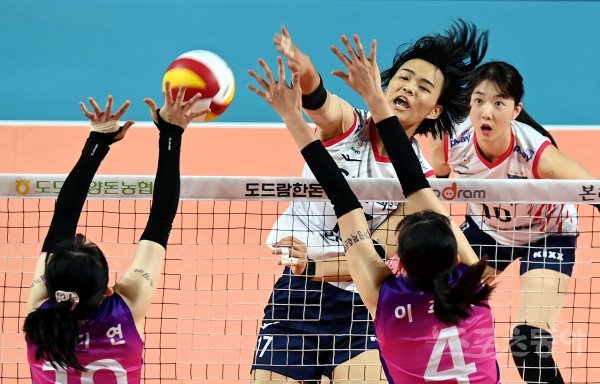 29일 인천 삼선월드체육관에서 ‘2022-2023 도드람 V리그’ 인천 흥국생명과 서울 GS칼텍스의 여자부 경기가 열렸다. GS칼텍스 문지윤이 흥국생명 블로커를 피해 스파이크를 날리고 있다.