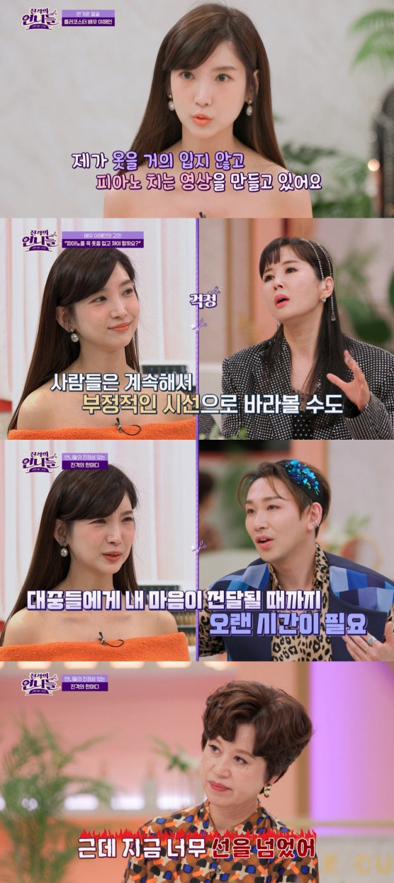 마지막으로 과거 ‘롤러코스터’에 출연했던 데뷔 17년 차 배우 \'롤코녀\' 이해인이 손님으로 등장했다. 현재는 100만 유튜버로 활동하고 있는 그는 "피아노를 칠 때 꼭 옷을 입고 쳐야 하냐?"는 황당한 질문으로 언니들 트리오를 초토화시켰다. 노출이 심한 의상을 입고 피아노를 치는 파격적인 콘텐츠로 화제를 몰고 있는 이해인은 연기에 대한 열망이 있었지만, 기회가 닿지 않았다고 밝혔다. 카메라 앞에서 일했던 시절에 대한 목마름 때문에 유튜브로 전향했다며 “더한 노출도 할 수 있다”는 이해인에게 장영란은 “노출 수위가 센 영상들만 업로드가 된다면, 외적인 모습만 강조될 뿐 연기력을 보여주기 어렵다”며 안타까워했다.