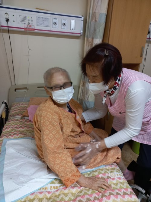 부산 온요양병원에서 간병사가 환자를 돌보는 모습. 사진제공|온종합병원