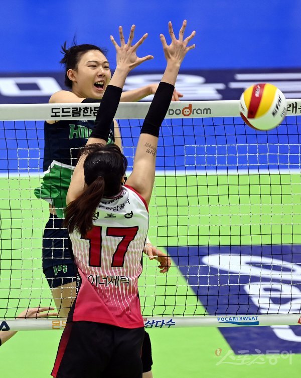 30일 경기도 수원체육관에서 ‘2022-2023 도드람 V리그’ 수원 현대건설과 대전 KGC인삼공사의 여자부 경기가 열렸다. 현대건설 양효진이 KGC인삼공사 블로커를 피해 공격을 펼치고 있다.
