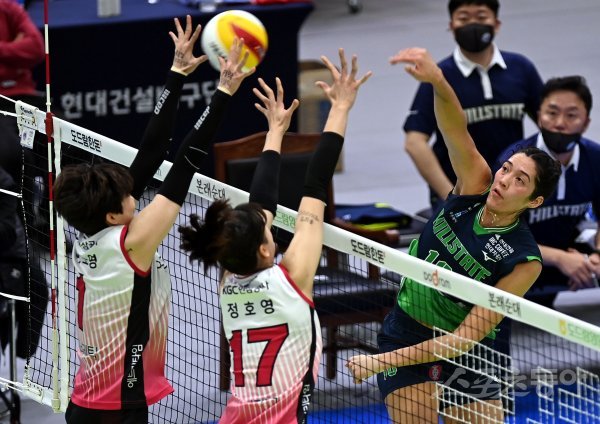 30일 경기도 수원체육관에서 ‘2022-2023 도드람 V리그’ 수원 현대건설과 대전 KGC인삼공사의 여자부 경기가 열렸다. 현대건설 야스민이 KGC인삼공사 블로커를 피해 스파이크를 날리고 있다.