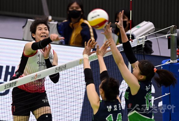 30일 경기도 수원체육관에서 ‘2022-2023 도드람 V리그’ 수원 현대건설과 대전 KGC인삼공사의 여자부 경기가 열렸다. KGC인삼공사 이소영이 현대건설 블로커를 피해 스파이크를 날리고 있다.
