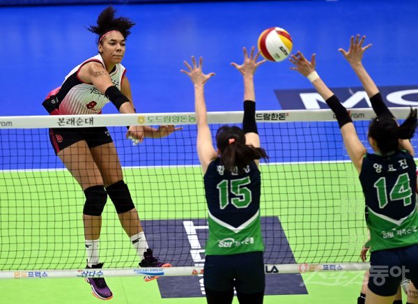 30일 경기도 수원체육관에서 ‘2022-2023 도드람 V리그’ 수원 현대건설과 대전 KGC인삼공사의 여자부 경기가 열렸다. KGC인삼공사 엘리자벳이 현대건설 블로커를 피해 스파이크를 날리고 있다.