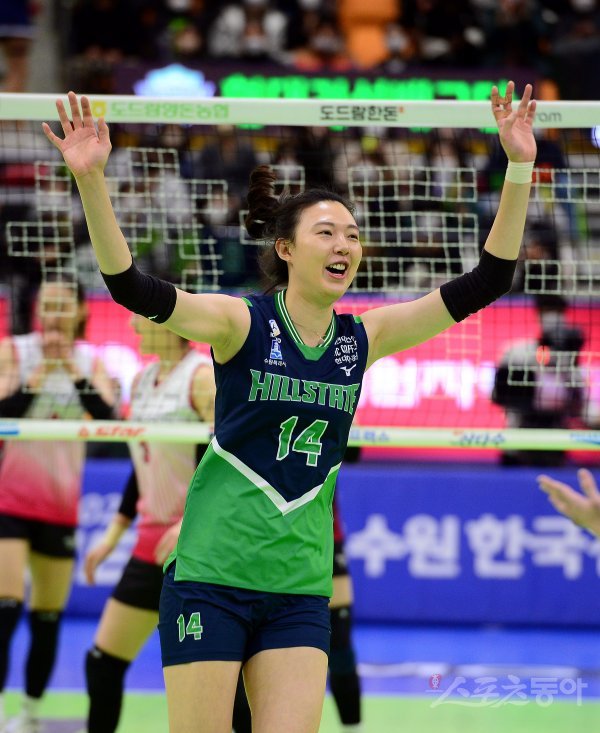 30일 경기도 수원체육관에서 ‘2022-2023 도드람 V리그’ 수원 현대건설과 대전 KGC인삼공사의 여자부 경기가 열렸다. 현대건설 양효진이 득점을 올린 후 환호하고 있다.