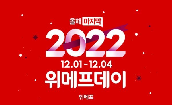 위메프는 12월 1일부터 4일까지 ‘위메프데이’를 열고, 다양한 상품을 모아 판매한다. 위메프데이는 매달 1일 진행하는 월간 특가 프로모션이다. 12월 기획전에선 한파철을 대비할 시즌 의류와 연말연시 홈파티에 유용한 베이커리 브랜드 금액권 등을 특가에 준비했다. 메인 행사인 ‘슈퍼위메프데이’에선 12월 추천 상품을 판매한다. 카테고리 인기 상품을 선별한 ‘카테고리 추천’ 코너도 마련했다. 행사 동안 사용할 수 있는 장바구니 쿠폰과 제휴 카드 할인 혜택도 제공한다.