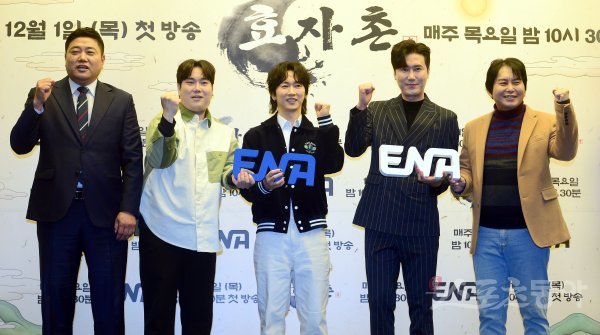 양준혁, 유재환, 장우혁, 신성, 윤기원이 1일 서울 마포구 상암동 스탠포드호텔에서 열린 ENA ‘효자촌’ 제작발표회에서 포토타임을 갖고 있다.