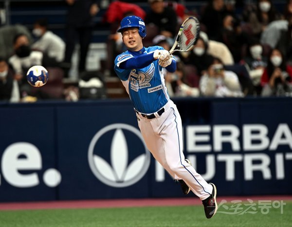 3일 서울 고척스카이돔에서 ‘2022 희망더하기 자선야구대회’가 열렸다. 종범신 팀 박효준이 테니스채로 핸드볼 공을 타격하고 있다.