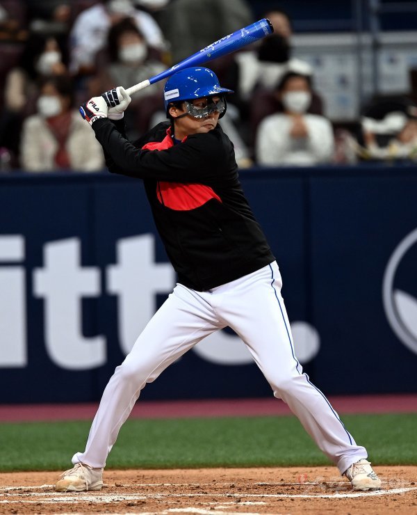 3일 서울 고척스카이돔에서 ‘2022 희망더하기 자선야구대회’가 열렸다. 양신 팀 정철원이 손흥민 마스크를 쓴 후 타격을 펼치고 있다.