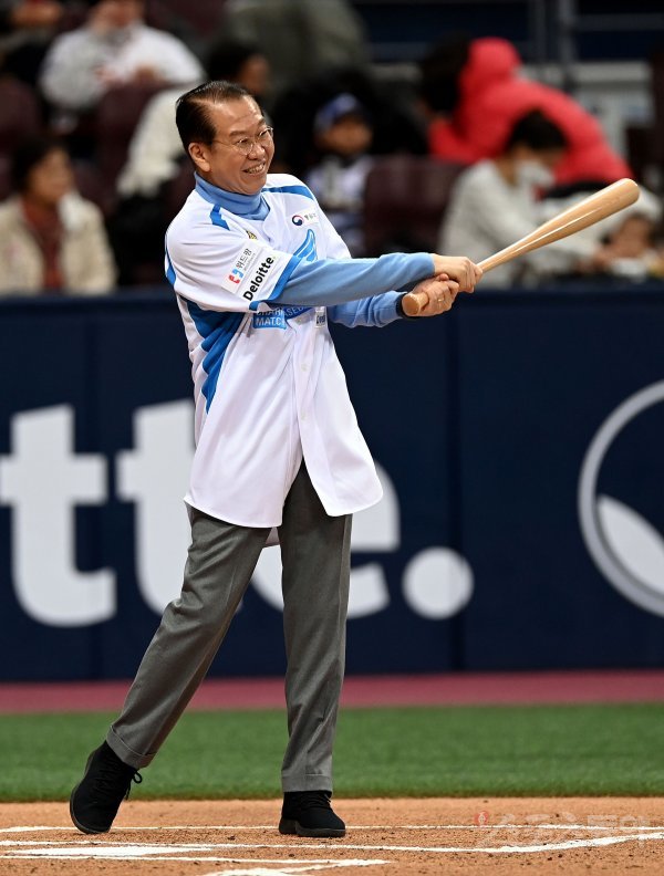 3일 서울 고척스카이돔에서 ‘2022 희망더하기 자선야구대회’가 열렸다. 권영세 통일부장관이 시타를 펼치고 있다.