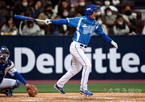3일 서울 고척스카이돔에서 ‘2022 희망더하기 자선야구대회’가 열렸다. 종범신 팀 박용택이 타격을 펼치고 있다.