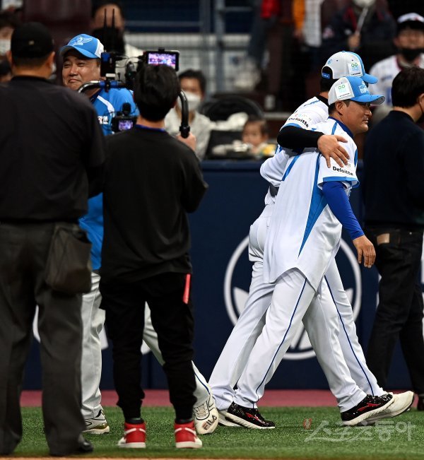 3일 서울 고척스카이돔에서 ‘2022 희망더하기 자선야구대회’가 열렸다. 양신팀 양준혁 감독과 종범신 팀 이종범 감독이 트레이드되고 있다.