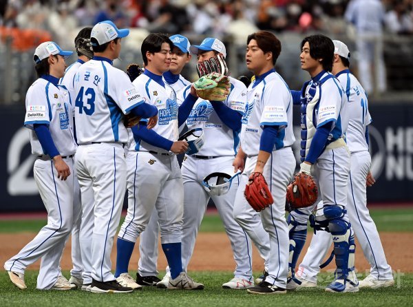 3일 서울 고척스카이돔에서 ‘2022 희망더하기 자선야구대회’가 열렸다. 양신 팀이 종범신 팀을 상대로 7-4로 승리한 후 선수들이 그라운드에서 기쁨을 나누고 있다.