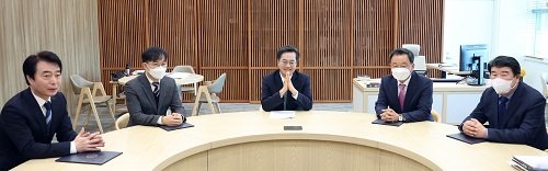 (왼쪽부터) 조신 경기도시장상권진흥원 원장, 채이배 경기도일자리재단 대표이사, 김동연 경기지사, 민경선 경기교통공사 사장, 조원용 경기관광공사 사장. 사진제공 | 경기도