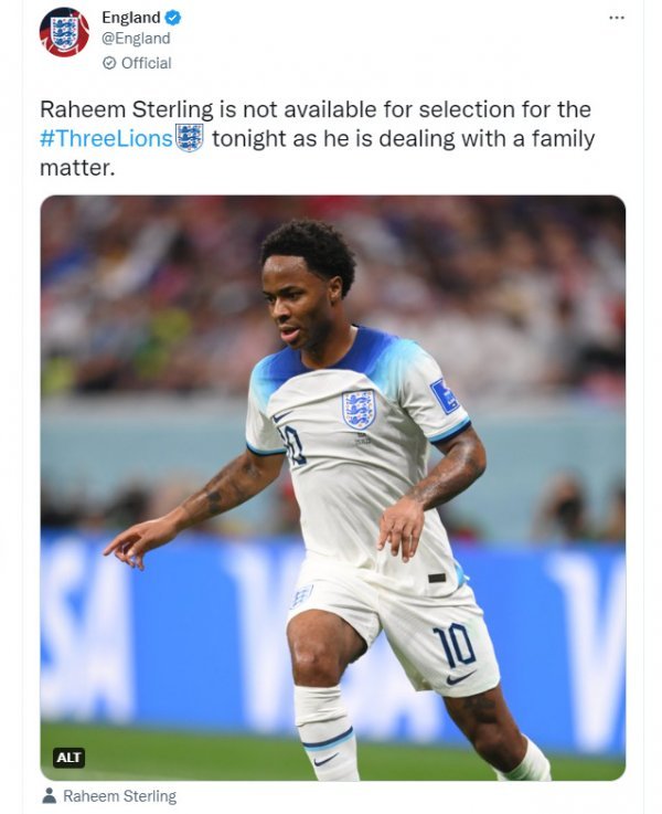 잉글랜드는 세네갈을 3-0으로 물리치고 8강에 올랐다. 그런데 경기 전 주축 공격수인 스털링이 명단에 포함되지 않아 의문을 자아냈다. 잉글랜드축구협회(FA)는 트위터를 통해 스털링이 빠진 이유를 “가족 문제”라고만 설명했다.