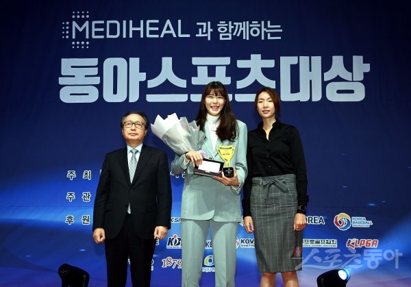 스포츠동아가 동아일보, 채널A, 메디힐과 공동으로 주최하고 국내 5대 프로스포츠(프로야구·프로축구·남녀프로농구·남녀프로배구·남녀프로골프) 종목별로 올 한해를 빛낸 최고의 선수를 선정하는 ‘메디힐과 함께하는 2022 동아스포츠대상‘ 시상식이 5일 서울 중구 롯데호텔서울 크리스탈볼룸에서 개최됐다. 여자프로농구 올해의 선수상을 수상한 박지수(KB스타즈)가 이병완 한국여자농구연맹(WKBL) 총재, 정진경 한국여자농구연맹(WKBL) 경기본부장과 기념촬영을 하고 있다.