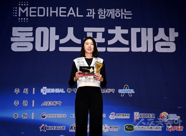 스포츠동아가 동아일보, 채널A, 메디힐과 공동으로 주최하고 국내 5대 프로스포츠(프로야구·프로축구·남녀프로농구·남녀프로배구·남녀프로골프) 종목별로 올 한해를 빛낸 최고의 선수를 선정하는 ‘메디힐과 함께하는 2022 동아스포츠대상‘ 시상식이 5일 서울 중구 롯데호텔서울 크리스탈볼룸에서 개최됐다. 여자프로배구 올해의 선수상을 수상한 양효진(현대건설)이 기념촬영을 하고 있다.