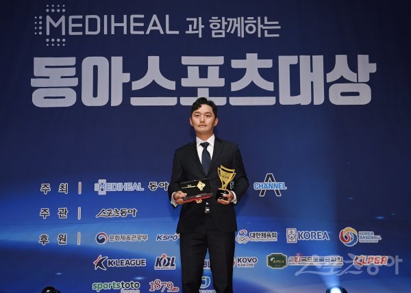 스포츠동아가 동아일보, 채널A, 메디힐과 공동으로 주최하고 국내 5대 프로스포츠(프로야구·프로축구·남녀프로농구·남녀프로배구·남녀프로골프) 종목별로 올 한해를 빛낸 최고의 선수를 선정하는 ‘메디힐과 함께하는 2022 동아스포츠대상‘ 시상식이 5일 서울 중구 롯데호텔서울 크리스탈볼룸에서 개최됐다. 남자프로골프 올해의 선수상을 수상한 김영수(PNS홀딩스)가 기념촬영을 하고 있다.