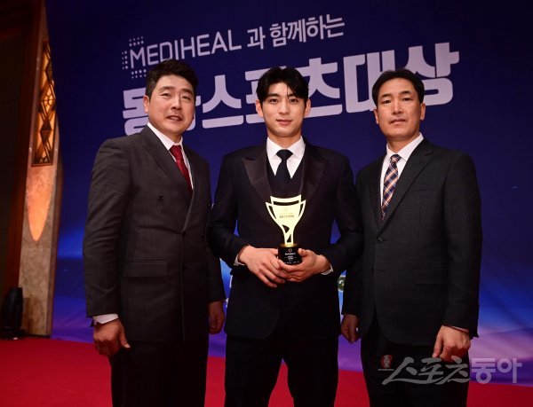 스포츠동아가 동아일보, 채널A, 메디힐과 공동으로 주최하고 국내 5대 프로스포츠(프로야구·프로축구·남녀프로농구·남녀프로배구·남녀프로골프) 종목별로 올 한해를 빛낸 최고의 선수를 선정하는 ‘메디힐과 함께하는 2022 동아스포츠대상‘ 시상식이 5일 서울 중구 롯데호텔서울 크리스탈볼룸에서 개최됐다. 프로야구 올해의 선수상을 수상한 이정후(키움)가 홍원기 감독, 고형욱 단장과 기념촬영을 하고 있다.