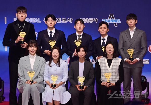스포츠동아가 동아일보, 채널A, 메디힐과 공동으로 주최하고 국내 5대 프로스포츠(프로야구·프로축구·남녀프로농구·남녀프로배구·남녀프로골프) 종목별로 올 한해를 빛낸 최고의 선수를 선정하는‘메디힐과 함께하는 2022 동아스포츠대상‘ 시상식이 5일 서울 중구 롯데호텔서울 크리스탈볼룸에서 개최됐다. 올해의 선수상을 수상한 최준용(남자프로농구), 이정후(프로야구), 신진호(프로축구), 김영수(남자프로골프), 한선수(남자프로배구), 양효진(여자프로배구), 안나린(메디힐특별상), 박민지(여자프로골프), 박지수(여자프로농구)(왼쪽 윗줄에서 시계방향)가 기념촬영을 하고 있다.
