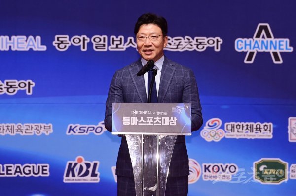 스포츠동아가 동아일보, 채널A, 메디힐과 공동으로 주최하고 국내 5대 프로스포츠(프로야구·프로축구·남녀프로농구·남녀프로배구·남녀프로골프) 종목별로 올 한해를 빛낸 최고의 선수를 선정하는 ‘메디힐 함께하는 2022 동아스포츠대상‘ 시상식이 5일 서울 중구 롯데호텔서울 크리스탈볼룸에서 개최됐다. 동아일보 김재호 사장이 개회사를 하고 있다.