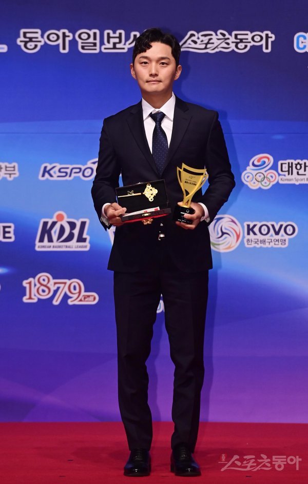 스포츠동아가 동아일보, 채널A, 메디힐과 공동으로 주최하고 국내 5대 프로스포츠(프로야구·프로축구·남녀프로농구·남녀프로배구·남녀프로골프) 종목별로 올 한해를 빛낸 최고의 선수를 선정하는 ‘메디힐과 함께하는 2022 동아스포츠대상‘ 시상식이 5일 서울 중구 롯데호텔서울 크리스탈볼룸에서 개최됐다. 남자프로골프 올해의 선수상을 수상한 김영수(PNS홀딩스)가 기념촬영을 하고 있다.
