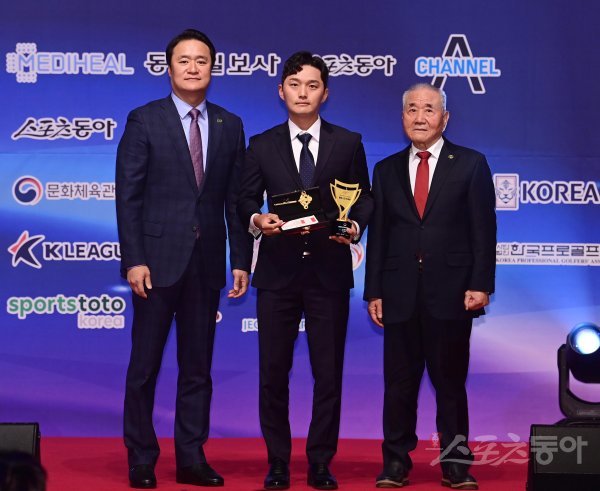 스포츠동아가 동아일보, 채널A, 메디힐과 공동으로 주최하고 국내 5대 프로스포츠(프로야구·프로축구·남녀프로농구·남녀프로배구·남녀프로골프) 종목별로 올 한해를 빛낸 최고의 선수를 선정하는 ‘메디힐과 함께하는 2022 동아스포츠대상‘ 시상식이 5일 서울 중구 롯데호텔서울 크리스탈볼룸에서 개최됐다. 남자프로골프 올해의 선수상을 수상한 김영수(PNS홀딩스)가 김병준 한국프로골프투어(KPGT) 대표이사, 한장상 한국프로골프협회(KPGA) 고문과 기념촬영을 하고 있다.