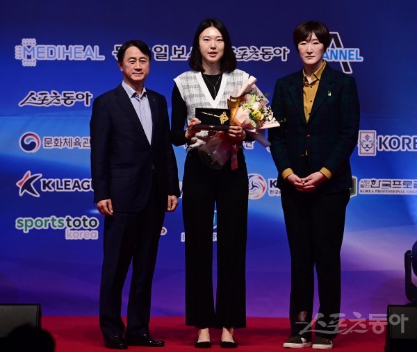 스포츠동아가 동아일보, 채널A, 메디힐과 공동으로 주최하고 국내 5대 프로스포츠(프로야구·프로축구·남녀프로농구·남녀프로배구·남녀프로골프) 종목별로 올 한해를 빛낸 최고의 선수를 선정하는 ‘메디힐과 함께하는 2022 동아스포츠대상‘ 시상식이 5일 서울 중구 롯데호텔서울 크리스탈볼룸에서 개최됐다. 여자프로배구 올해의 선수상을 수상한 양효진(현대건설)이 신무철 한국배구연맹(KOVO) 사무총장, 장소연 SBS해설위원과 기념촬영을 하고 있다.