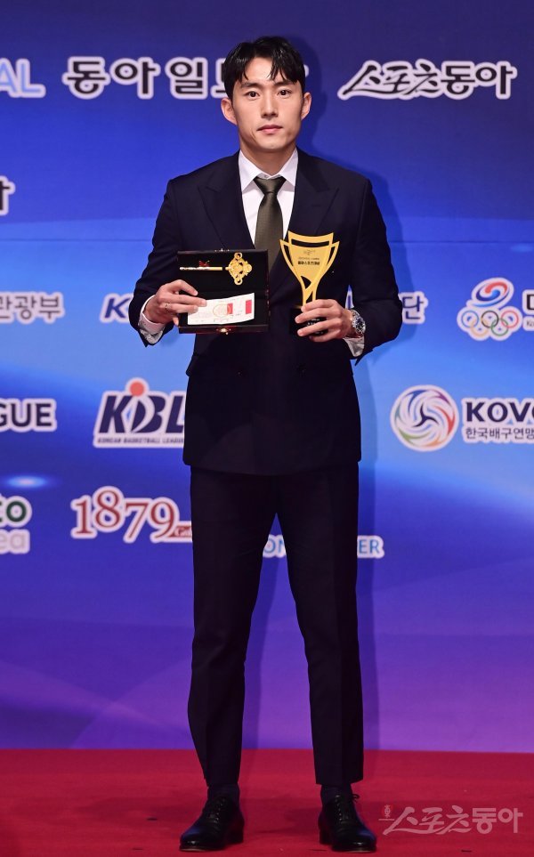 스포츠동아가 동아일보, 채널A, 메디힐과 공동으로 주최하고 국내 5대 프로스포츠(프로야구·프로축구·남녀프로농구·남녀프로배구·남녀프로골프) 종목별로 올 한해를 빛낸 최고의 선수를 선정하는 ‘메디힐과 함께하는 2022 동아스포츠대상‘ 시상식이 5일 서울 중구 롯데호텔서울 크리스탈볼룸에서 개최됐다. 프로축구 올해의 선수상을 수상한 신진호(포항 스틸러스)가 기념촬영을 하고 있다.
