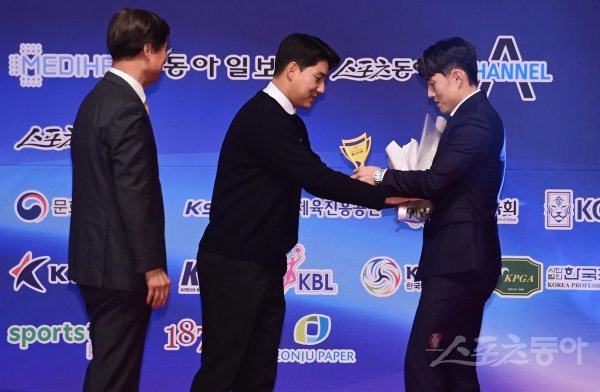 스포츠동아가 동아일보, 채널A, 메디힐과 공동으로 주최하고 국내 5대 프로스포츠(프로야구·프로축구·남녀프로농구·남녀프로배구·남녀프로골프) 종목별로 올 한해를 빛낸 최고의 선수를 선정하는 ‘메디힐과 함께하는 2022 동아스포츠대상‘ 시상식이 5일 서울 중구 롯데호텔서울 크리스탈볼룸에서 개최됐다. 프로축구 올해의 선수상을 수상한 신진호(포항 스틸러스)가 한웅수 한국프로축구연맹 부총재, 지난해 수상자 주민규로부터 트로피와 꽃다발을 받고 있다.